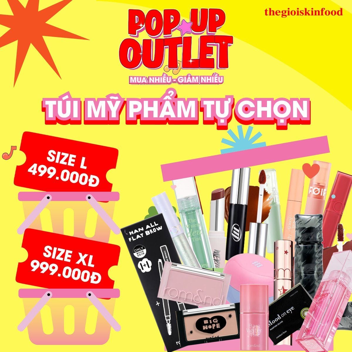 Túi mỹ phẩm tự chọn là 1 trong những sản phẩm Hot mà không thể bỏ qua khi đến với POP-UP Outlet. Đây là thử thách dành cho các "thánh" sắp xếp! Bạn chỉ cần chọn size túi, việc còn lại là sắp xếp thật nhiều mỹ phẩm vào để làm sao có thể zip được chiếc túi là bạn auto thắng. Đợt đầu năm này Thế giới skinfood có 2 size như sau: