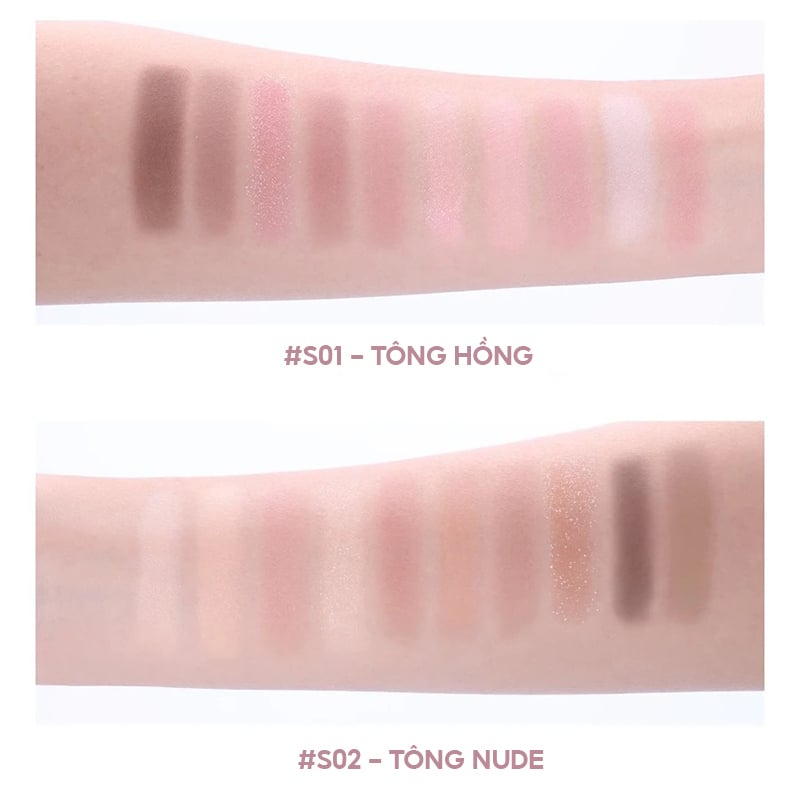 Bảng phấn có thiết kế 10 ô màu tích hợp nhiều sắc độ: matte – ánh nhũ.