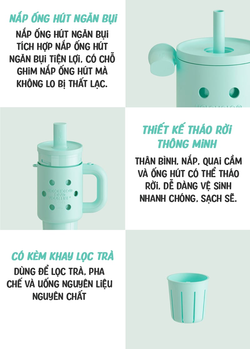 Cấu trúc tháo rời thông minh: Các bộ phận từ thân bình, quai cầm, nắp đến ống hút đều có thể tháo rời, giúp việc vệ sinh bên trong trở nên cực kỳ nhanh chóng và sạch sẽ.