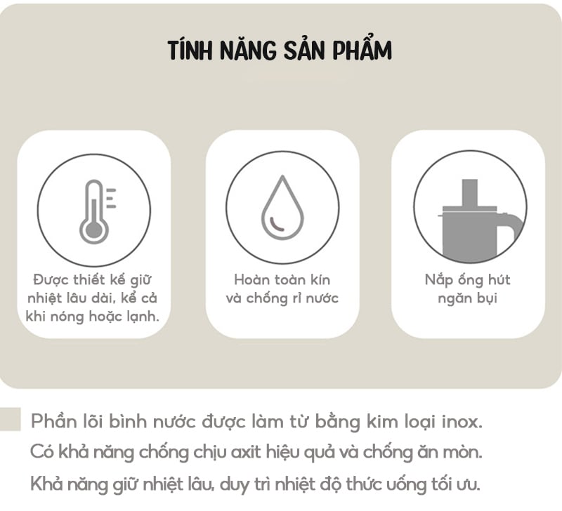 Khả năng giữ nhiệt tốt: Có khả năng giữ nhiệt lâu, duy trì nhiệt độ thức uống tối ưu. Bình có thể đựng được cả nước lạnh và nước ấm, phù hợp cho nhiều loại thức uống khác nhau.
