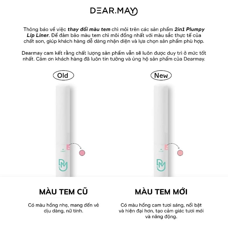 Chì Kẻ Viền Môi, Tạo Khối Môi 2 Đầu Dearmay 2In1 Plumpy Lip Liner là chì kẻ môi giúp định hình và giúp đôi môi thêm phần sắc nét đến từ thương hiệu Dearmay. Thiết kế tích hợp 2 trong 1 tiện lợi, vừa làm đầu chì viền môi hỗ trợ môi lên màu chuẩn, lâu trôi vừa làm đầu tạo khối giúp định hình môi chôi đôi môi thanh thoát và nổi bật hơn. Chất chì mềm tan như bơ nhờ thành phần chiết xuất từ dầu dừa, giúp chì lướt nhẹ trên môi và hỗ trợ làm mềm môi, tạo hiệu ứng môi căng mọng. Đầu chì vát nhọn dễ thao tác, định hình dáng môi.