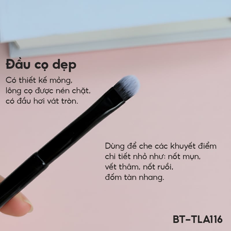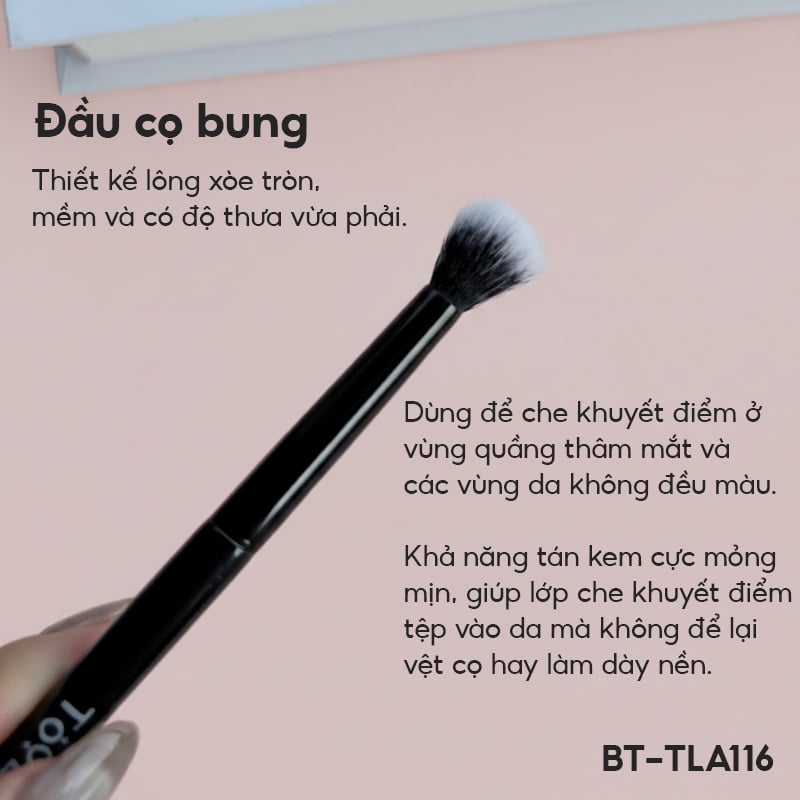 Cọ che khuyết điểm: Lấy lượng kem che khuyết điểm vừa đủ lên vùng cần che. Tán đều theo động tác dặm nhẹ hoặc miết nhẹ. Viền lại rìa cho tiệp da tự nhiên.