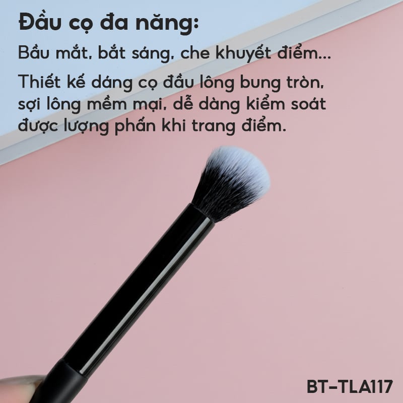 Đầu cọ đa năng: Dùng cho bầu mắt, bắt sáng, che khuyết điểm... Thiết kế dáng cọ đầu lông bung tròn, sợi lông mềm mại, dễ dàng kiểm soát được lượng phấn khi trang điểm.