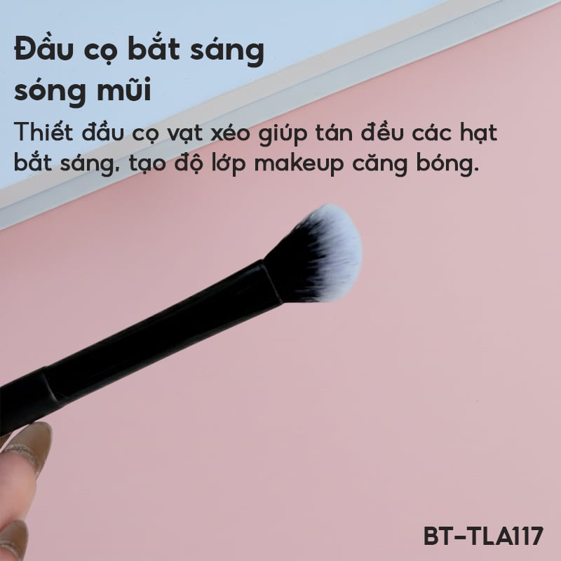 Đầu cọ bắt sáng sóng mũi: Thiết đầu cọ vạt xéo giúp tán đều các hạt bắt sáng, tạo độ lớp makeup căng bóng.