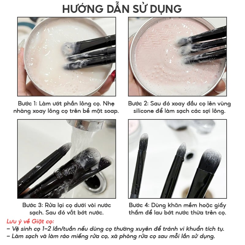 Vệ sinh cọ 1-2 lần/tuần nếu dùng cọ thường xuyên để tránh vi khuẩn tích tụ.
