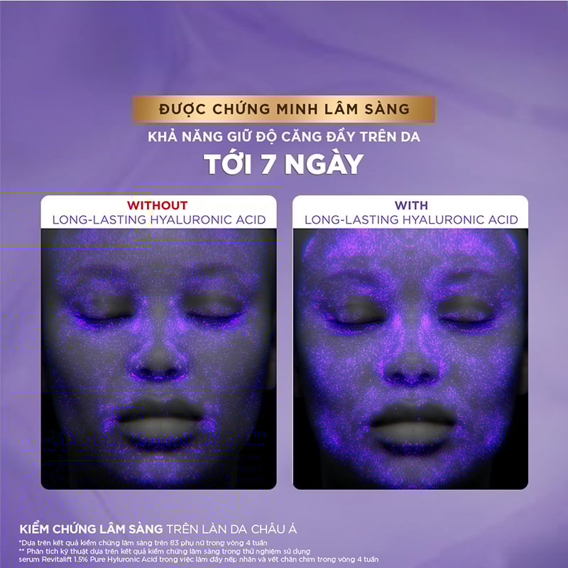 Công nghệ khóa ẩm bền vững từ Phytic Acid và Poly-lysine liên kết các phân tử HA lại với nhau tạo ra một lớp màng phim vô hình trên da, ngăn rãnh nhăn quay trở lại, duy trì hiệu quả căng mọng.