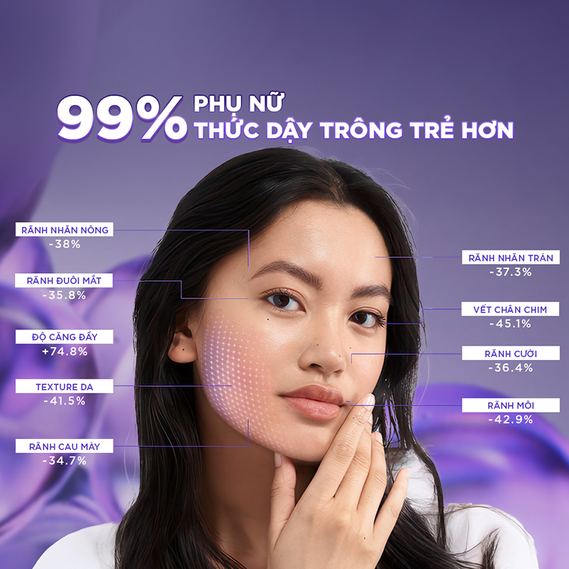 Chăm da hiệu quả với 2 công dụng cấp ẩm và làm đầy rãnh nhăn giúp da căng mọng và mịn màng hơn rõ rệt sau khi thức dậy..