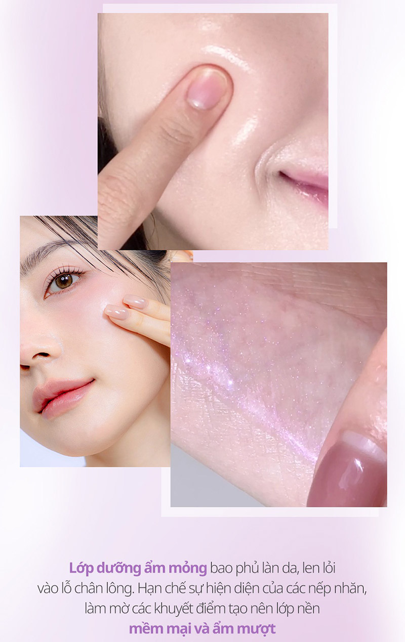 Kết cấu dạng lỏng nhẹ: Chất kem mỏng nhẹ cùng các hạt bột ngọc trai siêu nhỏ tạo nên ánh hồng tím - thẩm thấu nhanh vào da.
