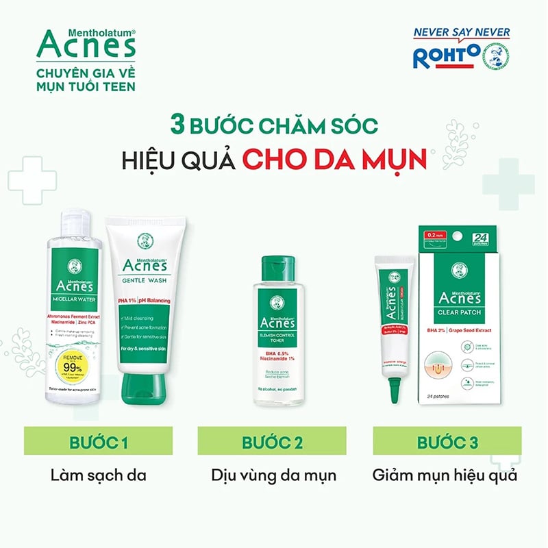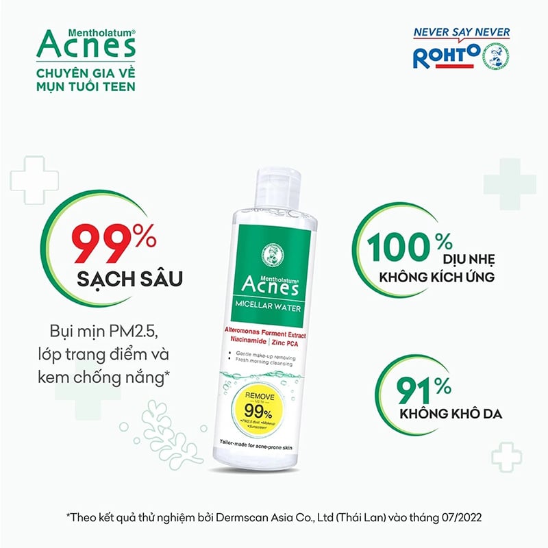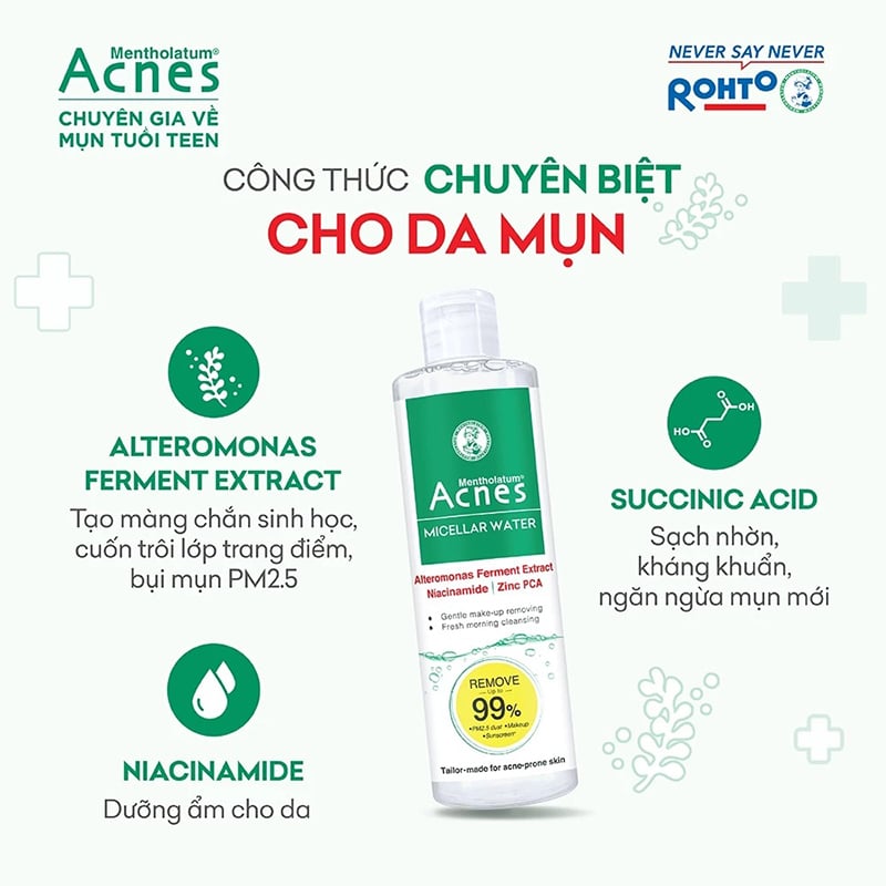 Nước Tẩy Trang Acnes Làm Sạch Dịu Nhẹ Cho Da Mụn Micellar Water là nước tẩy trang thuộc thương hiệu Acnes. Với công thức khả năng làm sạch đến 99% bụi mịn PM2.5, lớp trang điểm và kem chống nắng cho da mụn, mà không gây khô rít. Chứa thành phần Succinic Acid, Zinc PCA giúp làm sạch nhờn, dầu thừa từ đó giúp làm sạch da hạn chế tình trạng hình thành mụn mới.