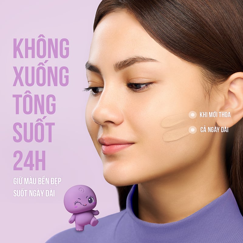 Mang đến lớp nền bền lì suốt 24 giờ, kiềm dầu hiệu quả, không xuống tone, kháng mồ hôi, chống nước, chống lem trôi, giúp làn da luôn tươi tắn, mịn màng cả ngày.