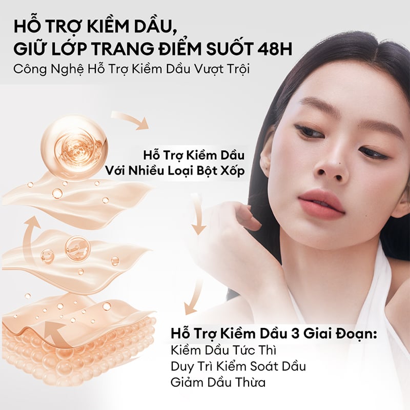 Công nghệ khóa lớp trang điểm, giúp nền sáng mịn rạng rỡ cả ngày.