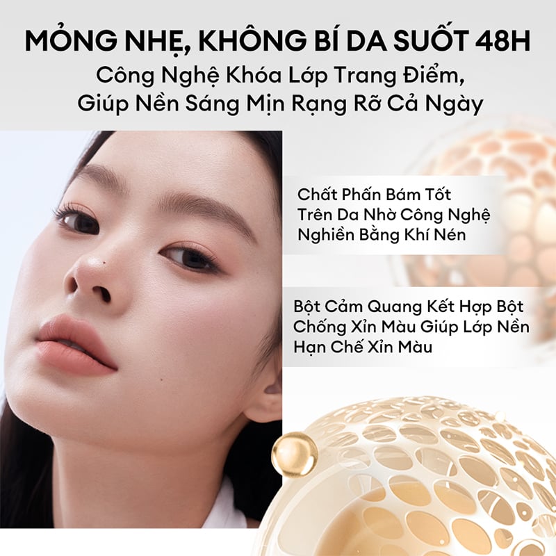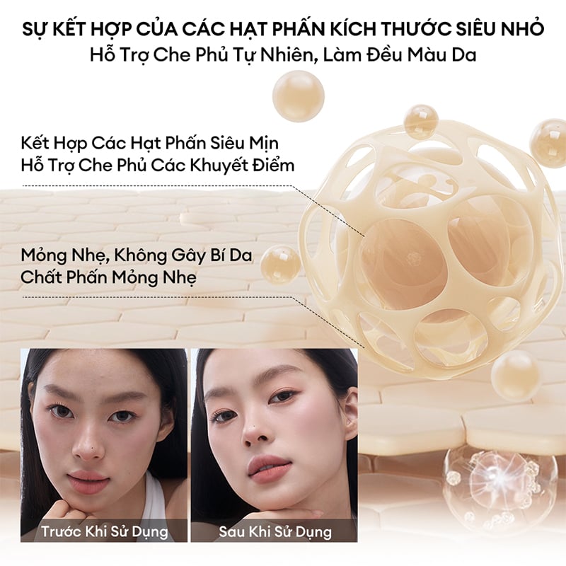 Hạt phấn có kích thước micromet siêu mỏng và mịn, giúp che phủ tự nhiên, làm đều màu da, mà không bí da suốt 48h.