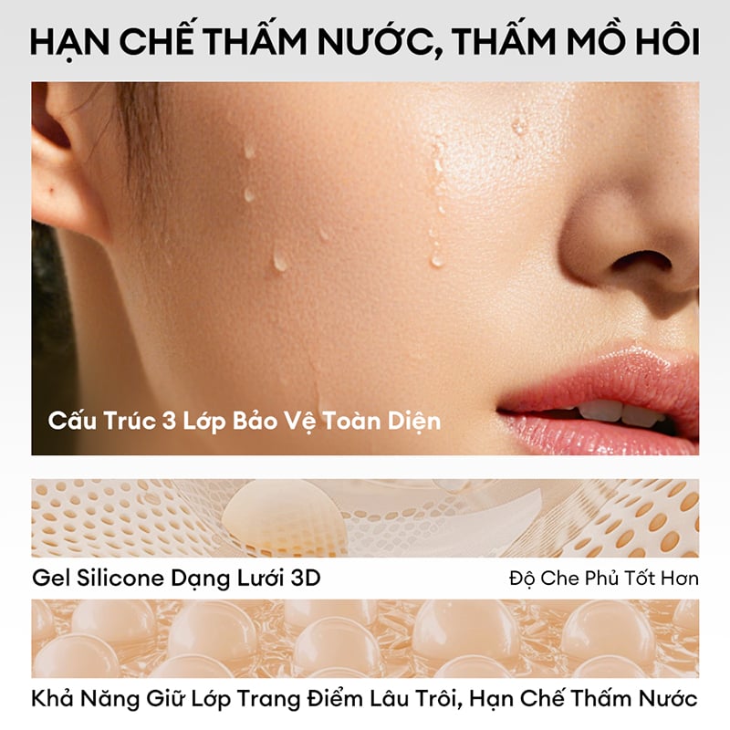 Cấu trúc 3 lớp kháng nước giúp bảo vệ lớp nền tránh tình trạng thấm nước, thấm mồ hôi như: gel silicone dạng lưới 3D; độ che phủ tốt hơn; khả năng giữ lớp trang điểm lâu trôi, hạn chế thấm nước.
