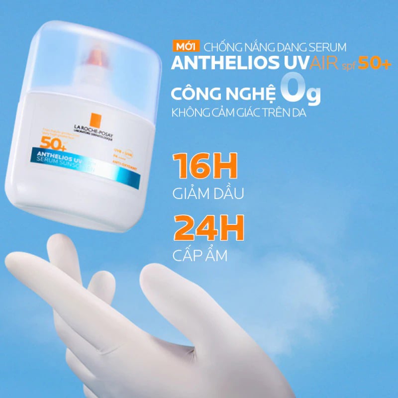 Serum Chống Nắng La Roche-Posay Siêu Mỏng, Kiềm Dầu, Cấp Ẩm Innovation Anthelios UVair Serum Sunscreen SPF50+ là dòng sản phẩm chống nắng thuộc thương hiệu La Roche-Posay. Công nghệ UVAIR mới có chất kem chống nắng dạng serum mỏng tan trên da mỏng nhẹ như khí, với bảo vệ 2 tầng chống UVA/UVA dài hạn chế bụi bẩn và bảo vệ da trước tác động ô nhiễm môi trường. Cùng với các hoạt chất dưỡng da như: HA, vitamin B3, E giúp da được cấp ẩm cần thiết suốt 24 giờ và kiềm dầu suốt 16 giờ.