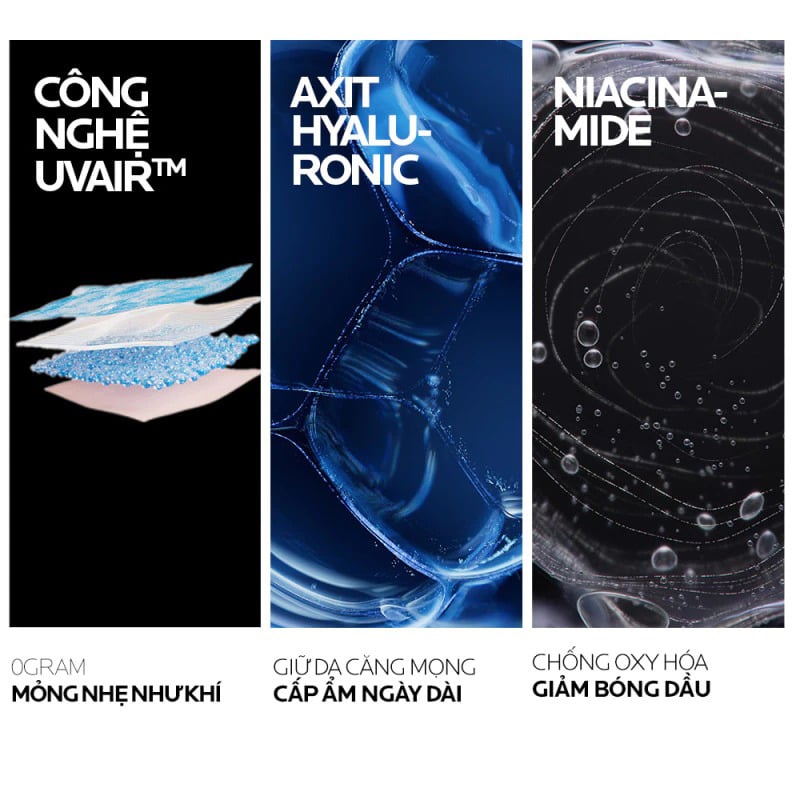 Công nghệ UVAIR chất kem chống nắng mỏng tan trên da mỏng nhẹ như khí, với bảo vệ 2 tầng chống UVA/UVA dài hạn chế bụi bẩn và bảo vệ da trước tác động ô nhiễm môi trường.