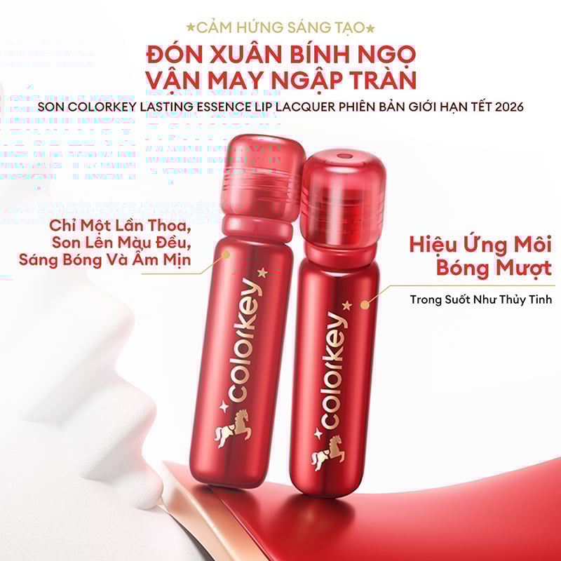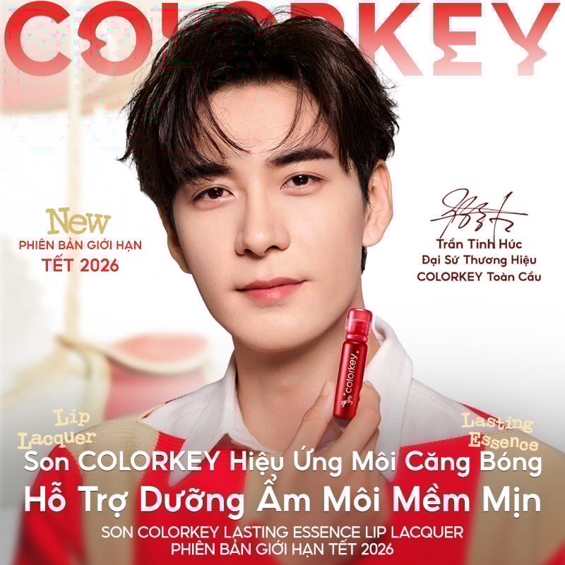 Son Bóng Colorkey Môi Căng Bóng, Dưỡng Ẩm Lasting Essence Lip Lacquer là son bóng của thương hiệu Colorkey với chất son ẩm mịn, dưỡng ẩm trên môi, cho môi có hiệu ứng căng bóng với bảng màu trendy dễ dùng cho đôi môi lên màu chuẩn, ẩm mịn, xinh xắn, rạng rỡ, với phiên bản giới hạn mừng tết 2026.