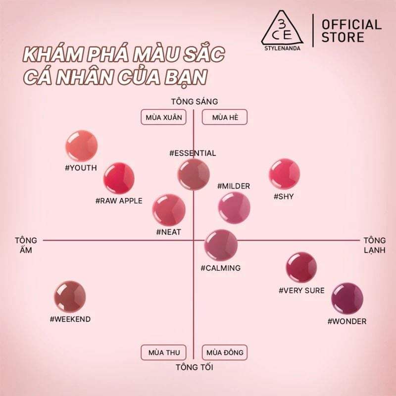 - Son Bóng Dạng Gel Căng Mọng 3CE Drop Glow Gel hiện đang bán các màu sau: