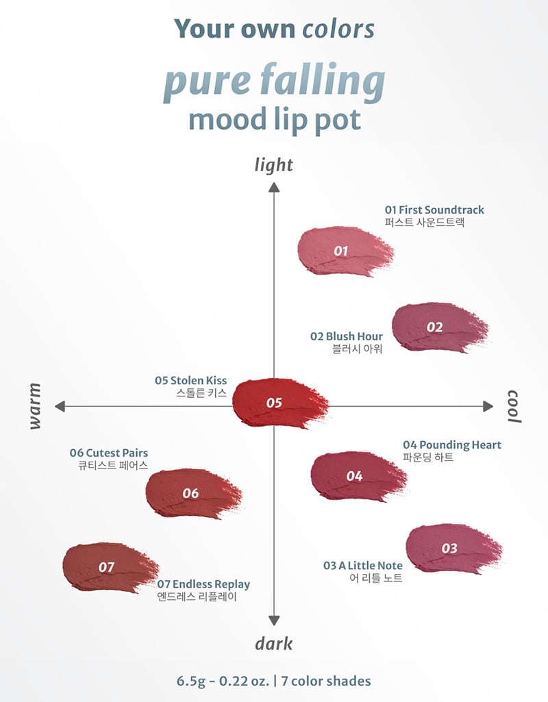 Son Kem Bùn Kiêm Má Hồng Mờ Lì Thuần Chay Dearmay Pure Falling Mood Lip Pot hiện đã có tại Thế giới Skinfood có các màu sau: