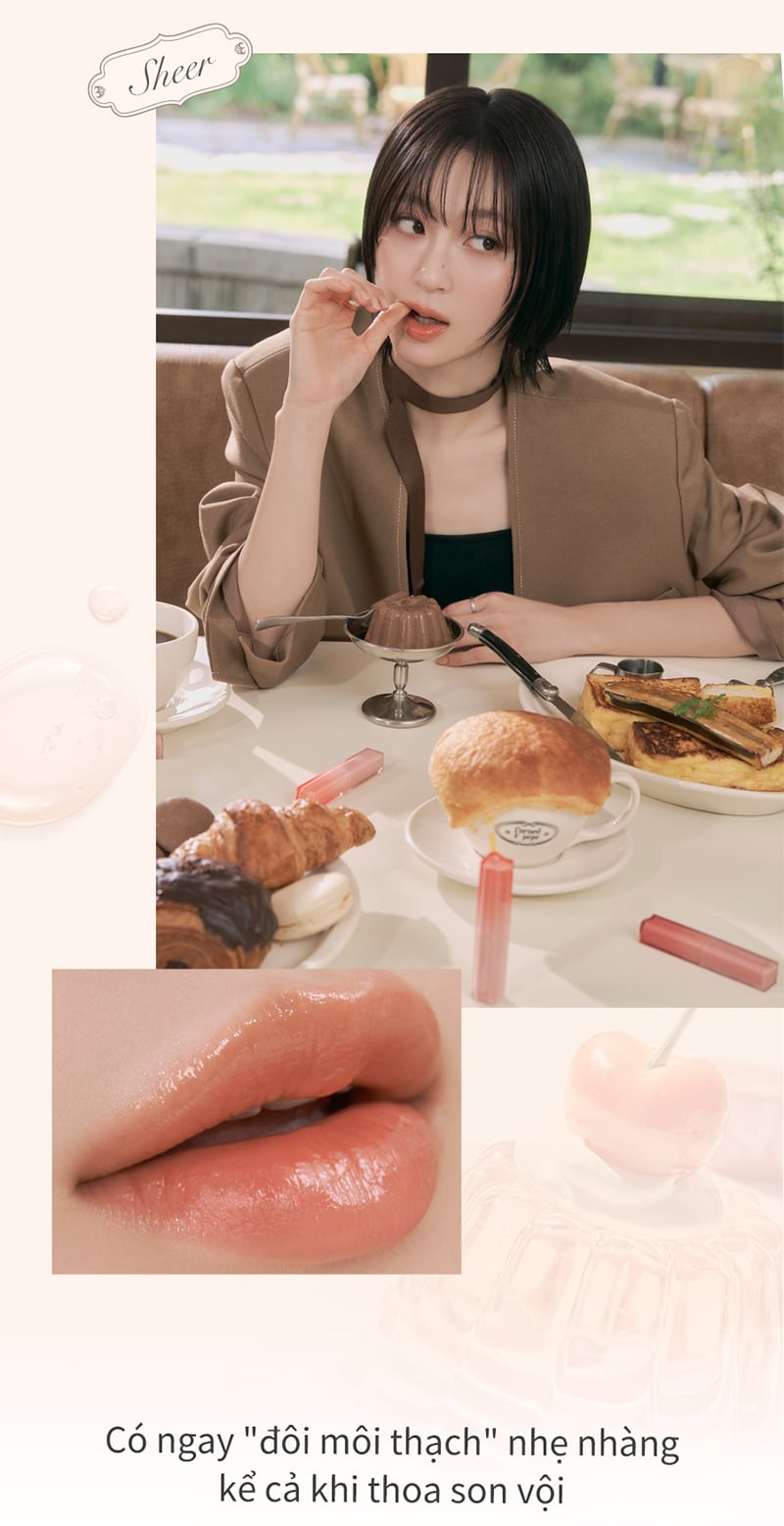 - Chất son trong trẻo, lớp bóng mỏng và độ sáng như miếng thạch.