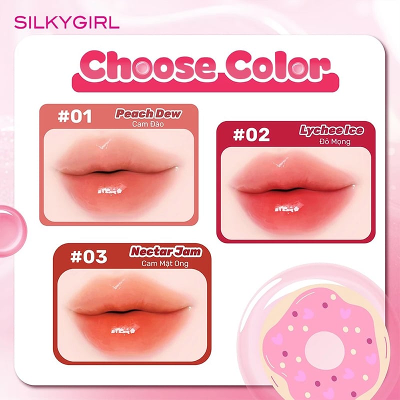 Son Tint Bóng Silkygirl Lâu Trôi, Cấp Ẩm Serum Lip Jelly hiện đang có tại Thế giới Skinfood với các tông màu sau: