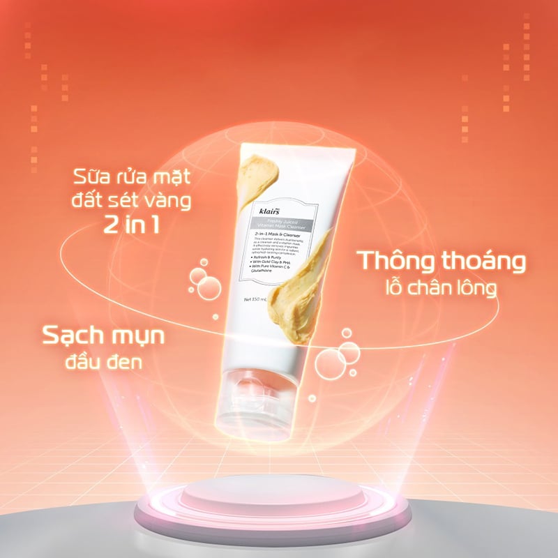 Sữa Rửa Mặt Klairs Hỗ Trợ Làm Sáng Da, Cải Thiện Lỗ Chân Lông Freshly Juiced Vitamin Mask Cleanser là sữa rửa mặt thuộc thương hiệu Klairs. Sản phẩm chứa thành phần nổi bật Gold Clay giúp nhẹ nhàng làm sạch da, loại bỏ bụi bẩn, bã nhờn. Cùng với những thành phần khác giúp loại bỏ tế bào chết nhẹ nhàng trên da, hỗ trợ dưỡng sáng và làm đều màu da bổ sung độ ẩm cho da ẩm mượt sau khi rửa mặt xong.