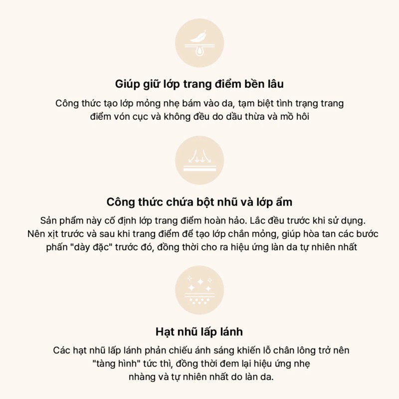 - Khả năng giữ lớp trang điểm bền màu, lâu trôi một cách hiệu quả mang lại vẻ tươi sáng cho làn da.