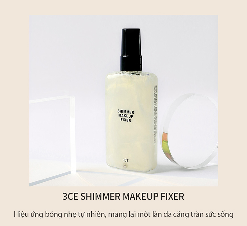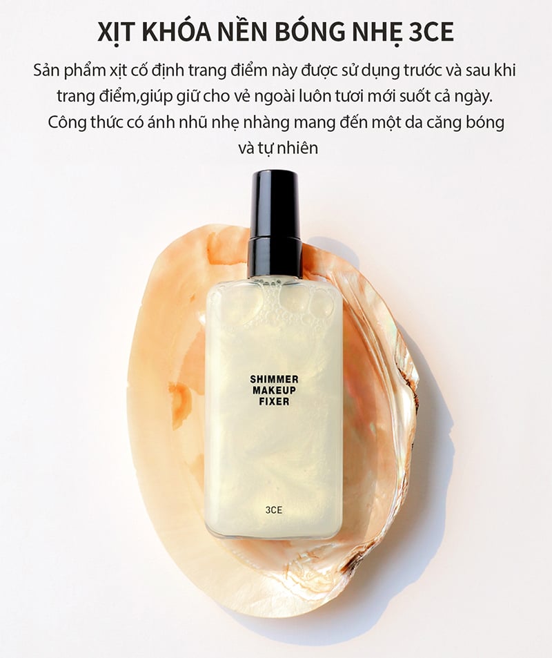 Xịt Cố Định Lớp Trang Điểm Căng Bóng 3CE Shimmer Makeup Fixer là xịt khoáng đến từ thương hiệu 3CE của Hàn Quốc. Công thức sản phẩm có ánh nhũ tạo nên hiệu ứng làn da óng ánh và căng bóng. Giữ lớp nền trang điểm bền màu lâu trôi, cùng với khả năng kiềm dầu và dưỡng ẩm cho da giúp làm dịu và củng cố hàng rảo bảo vệ da trước kích ứng môi trường.
